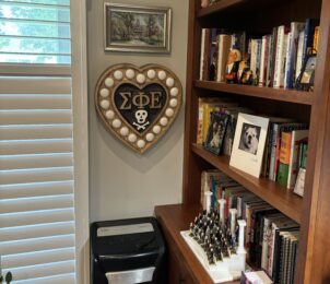 1. This Arkansas-shaped wall hanging featuring his university’s mascot and the SigEp heart, skull and crossbones was made in 2021 by Greg Steed, Central Arkansas ’93. In all, Steed has made 42 similar hangings for Arkansas Zeta brothers and other members of the Fraternity.